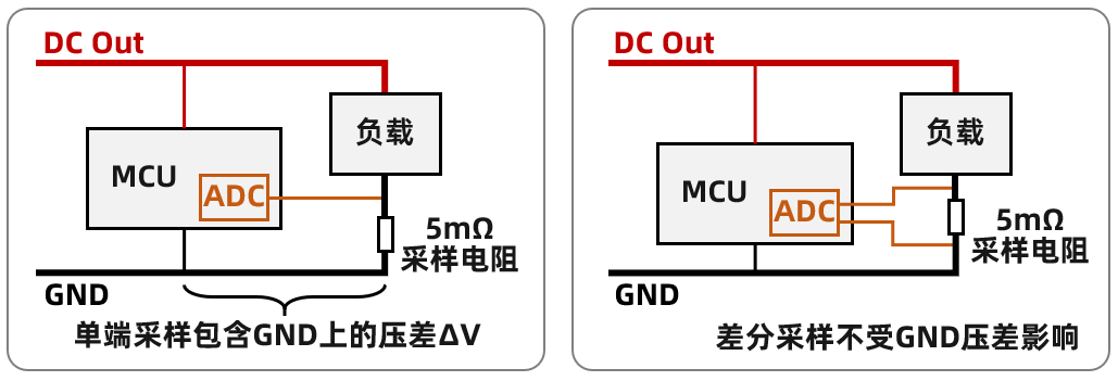 对于大功率的电源类应用,GND平面的电流路径上会产生压差。如果对电流使用单端采样,这种压差会影响采样准确性。使用差分采样可以很好地解决这个问题。