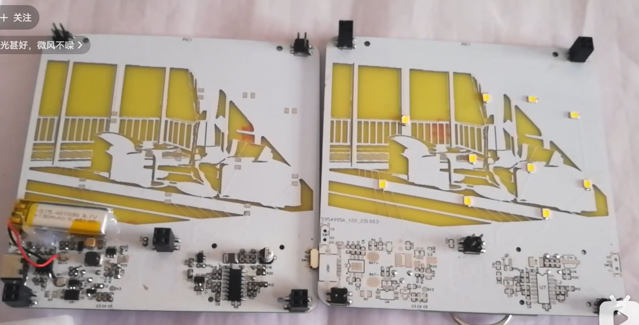画面板(下图中左侧)与灯光板(下图中右侧)使用的PCB完全相同,只是焊接了不同器件。