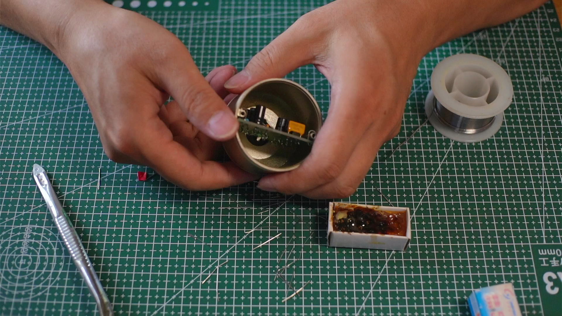 拆开一看,电路很简单,输出端是不平衡方式,所以底噪很大,没法用。正巧手头有一个25mm大振膜驻极体电容麦头,就准备制作一个电路板代替原有的简陋的板子。