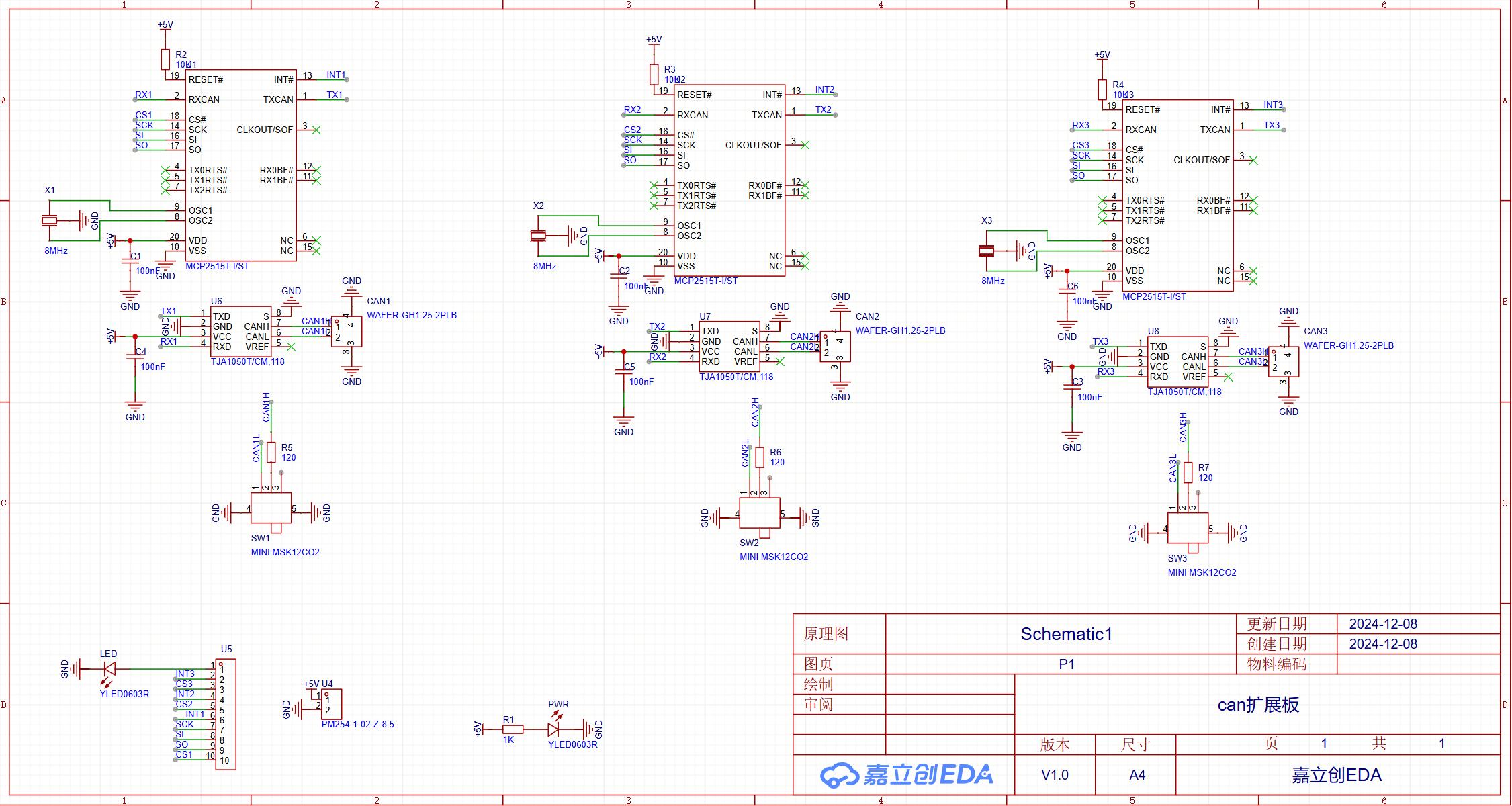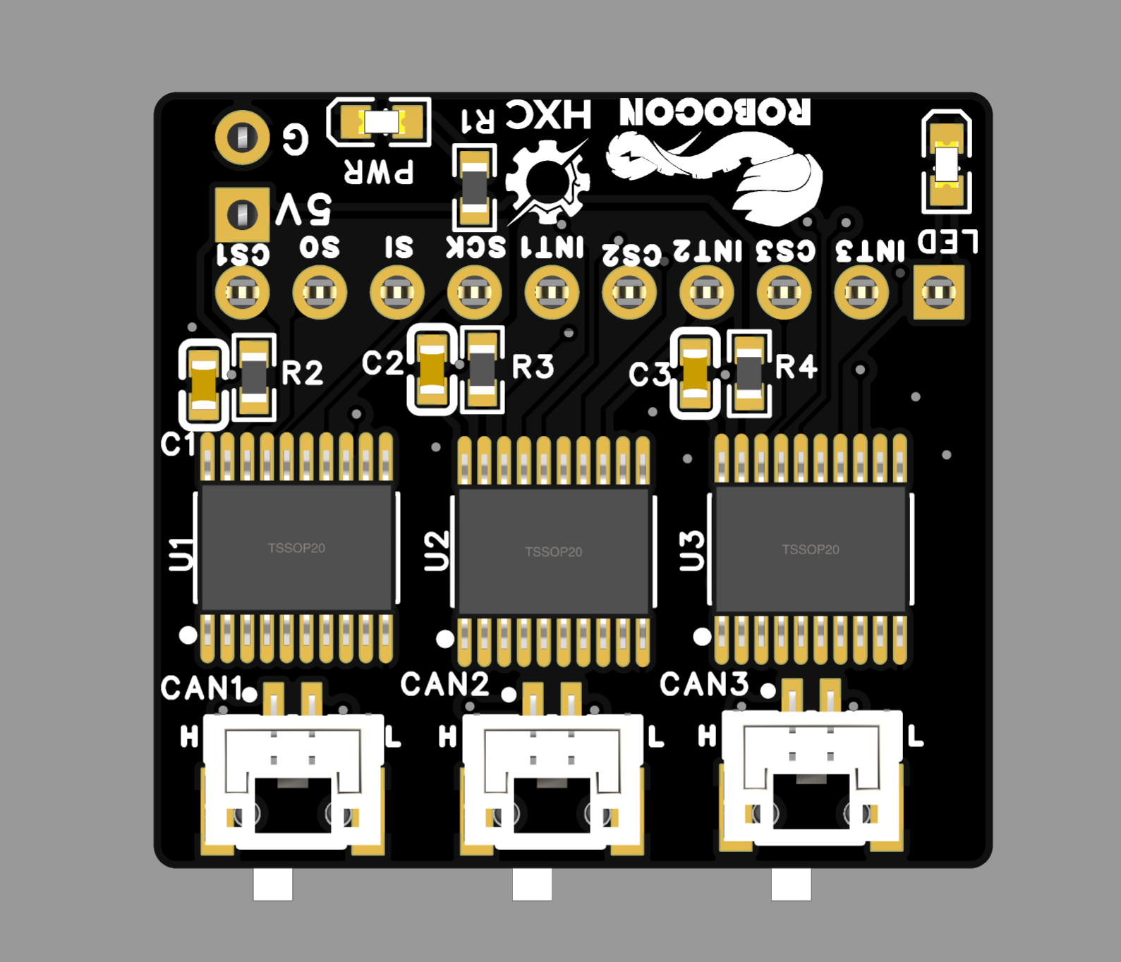 基于MCP2515+TJA1050的SPI转三路CAN扩展板,示例程序基于重庆邮电大学HXC战队为HXC开发板A型,可用于其他ESP32芯片。用于其他有SPI接口的MCU时需要自行编写驱动