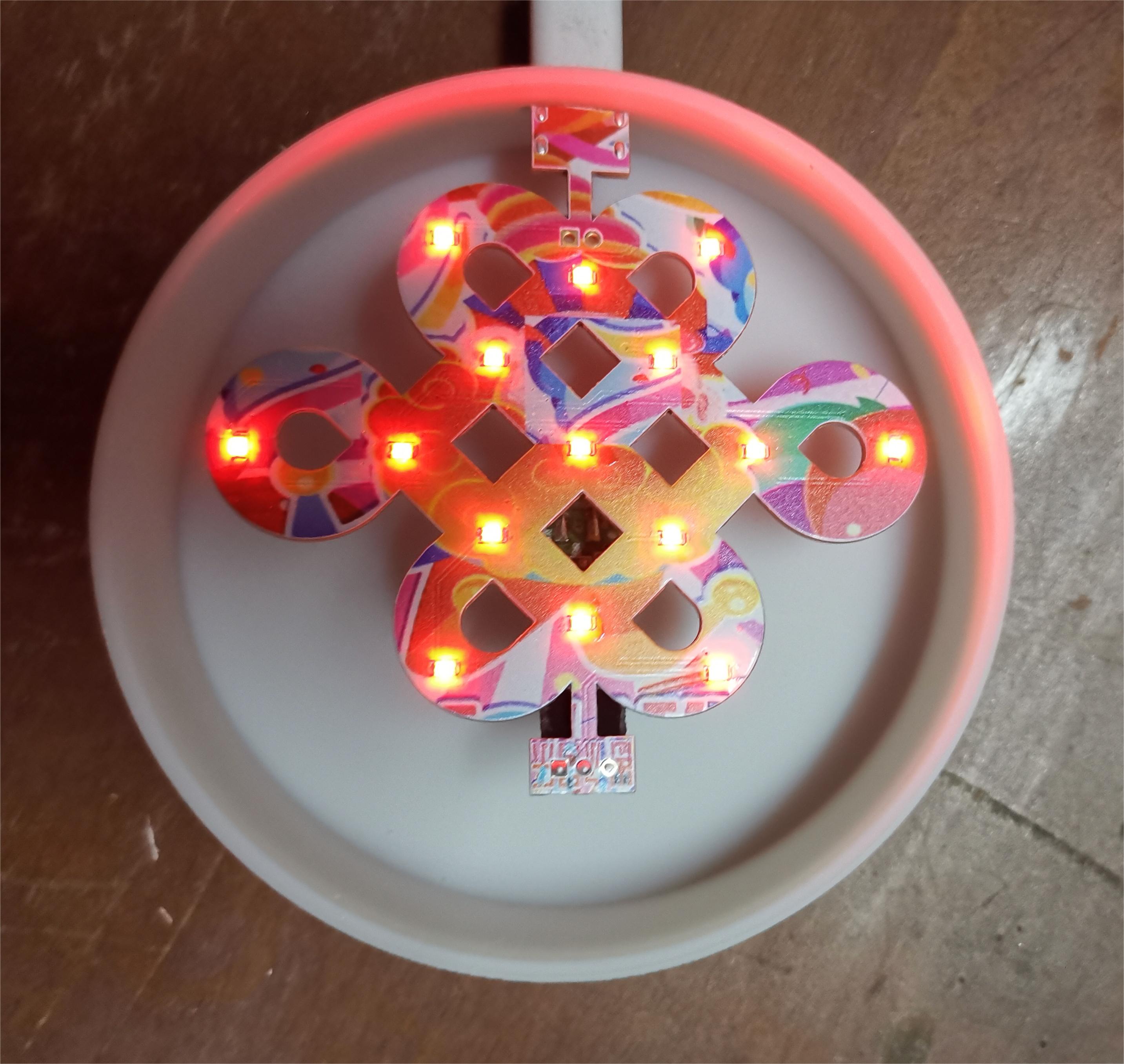将电子技术与传统中国文化元素融合,当有人经过的时候,通过人体热释传感模块控制LED发光,产生愚乐的效果。