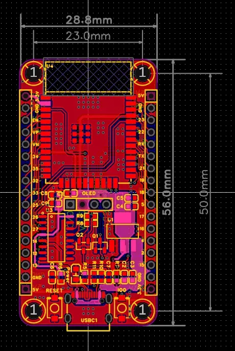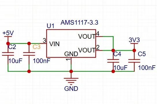 ESP32-WROOM-32E-N8模组需要3.3V电压供应,电源采用TYPE-C接口输入5V,再通过AMS1117降压芯片输出3.3V给芯片使用,AMS1117最大输出电流1A,足以满足模组供电需求。