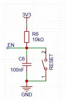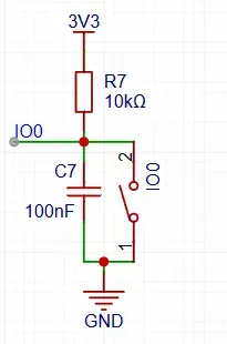 引出一个复位按键以及一个BOOT按键,BOOT按键在模组正常启动后,可作为一个普通按键使用,两个按键均加入RC延时电路,即可完成按键消抖,又为EN引脚的启动时序提供了模拟。