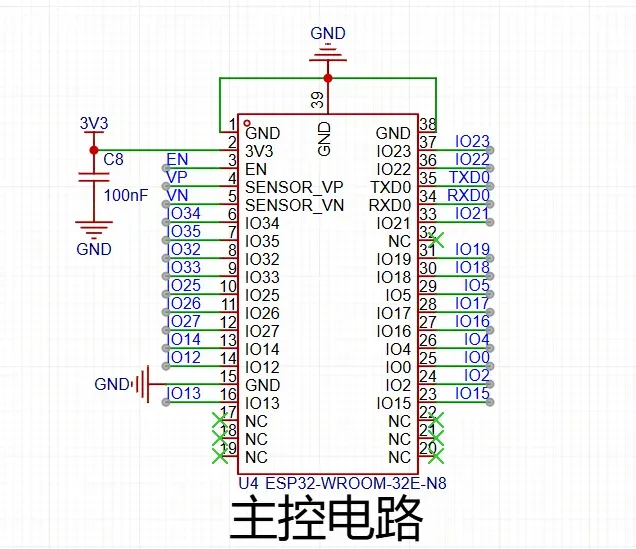 将ESP32-WROOM-32E-N8模组可用引脚全部引出,在模组电源输入部分增加100nf滤波电容,为模组提供稳定的电源输入。