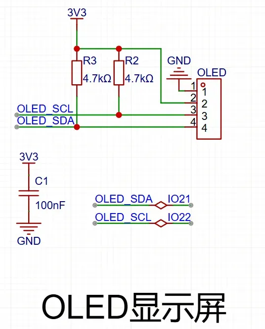 通过2.54*4P排母与OLED屏幕进行连接,在IIC数据总线上,加入4.7K上拉电阻,在电源输入部分,加入100nf电容来稳定电源。