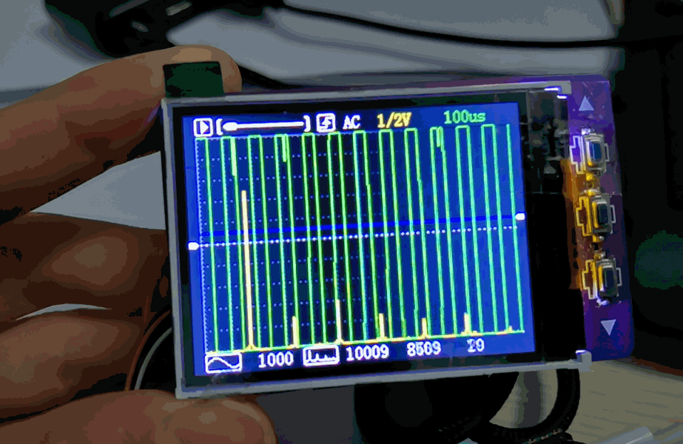 输入信号为5KHz方波,信号检测结果存在一定噪声,可能是电路中少焊接了部分滤波电容、电感器件导致的。