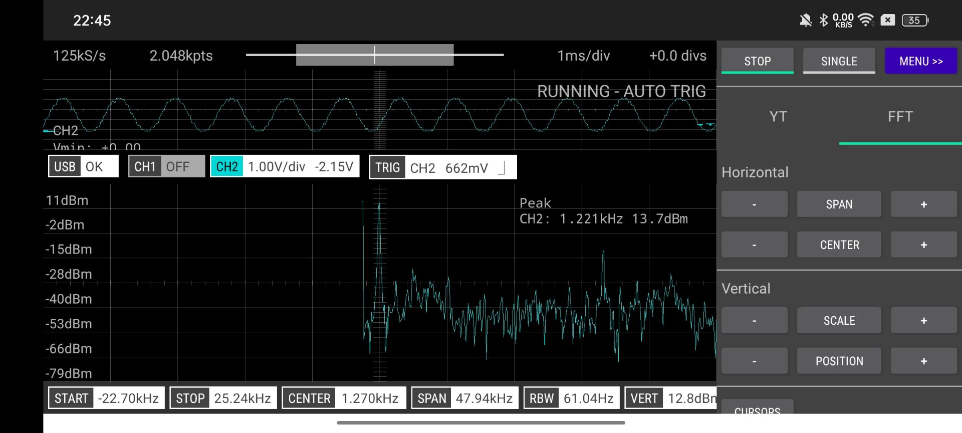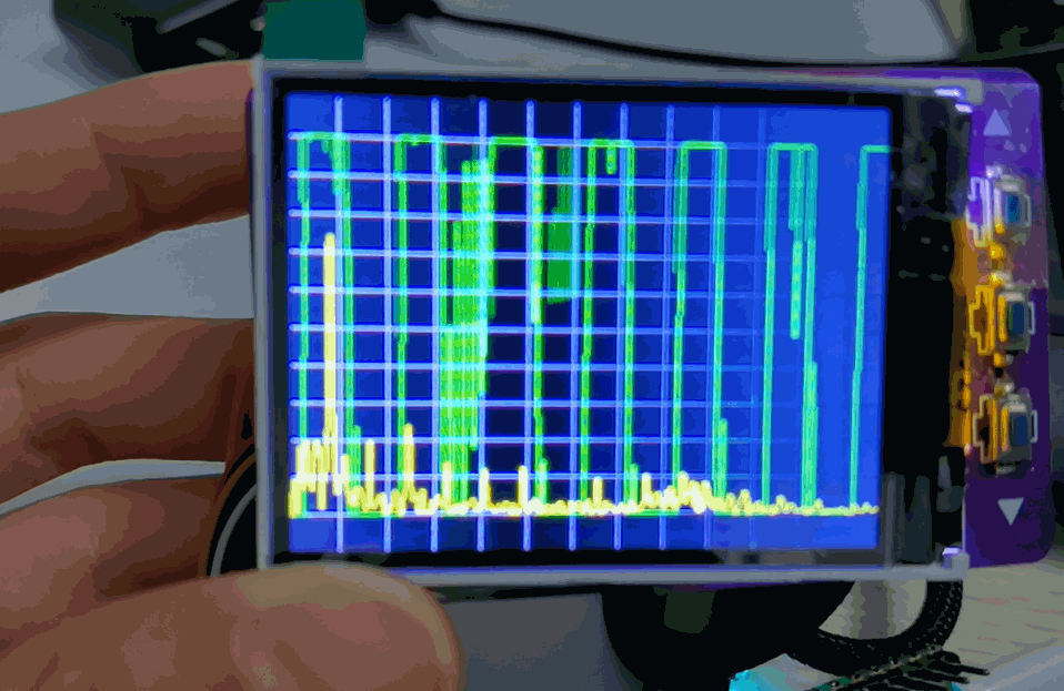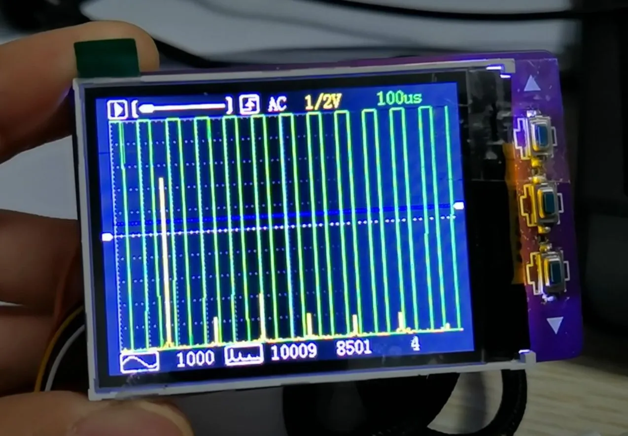 绿色波形线为输入信号波形,黄色波形线为FFT的幅频特性曲线。可以看到左侧有一明显波峰,这个波峰对应的横坐标表示当前输入信号的频率