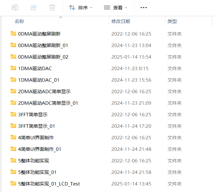 5.4、在软件设计方面,这方面涉及的内容有点多,一个是屏幕驱动和图像界面设计。教程中对此给出了详细的说明。主要的难点是对SPI通信和DMA传输的内容理解,还有帧缓存设计,需要完成外部SDRAM的驱动。示波器的主要功能是对输入信号进行检测,包括输入信号的频率、赋值等,在这检测过程中用到的最为有力的工具就是FFT,即快速傅里叶变换分析,FFT的实现是使用ARM官方提供的DSP库,该库适用于绝大多数的ARM内核芯片,而GD32F470正是基于Cortex-M4内核的处理器芯片。以下工程是从立创·梁山派教程资料处下载,其中有部分工程编译不通过,我已经做好工程修改,文末会将修改好的工程共享。