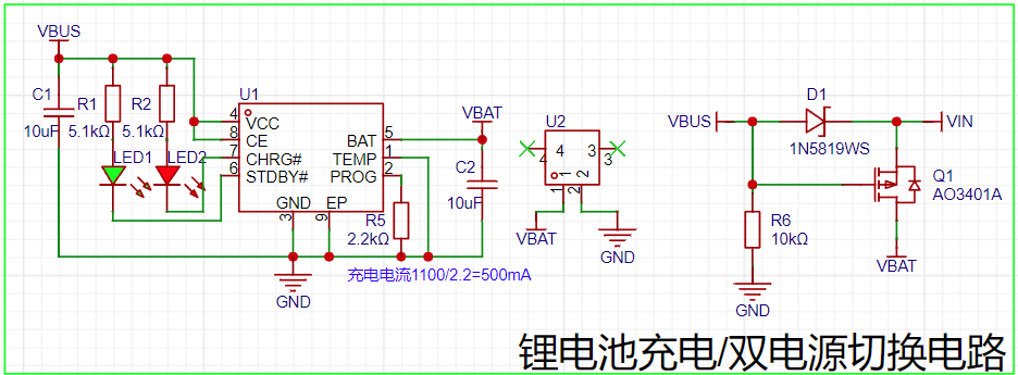 【1】板子采用USB/3.7V锂电池双供电系统,可通过type-c或单节锂电池供电,使用PMOS和二极管实现电源自动切换;当插入type-c数据线,二极管导通,PMOS截止,此时系统由USB供电,同时通过TP4056为锂电池充电;当拔出USB,PMOS导通,系统由锂电池供电。