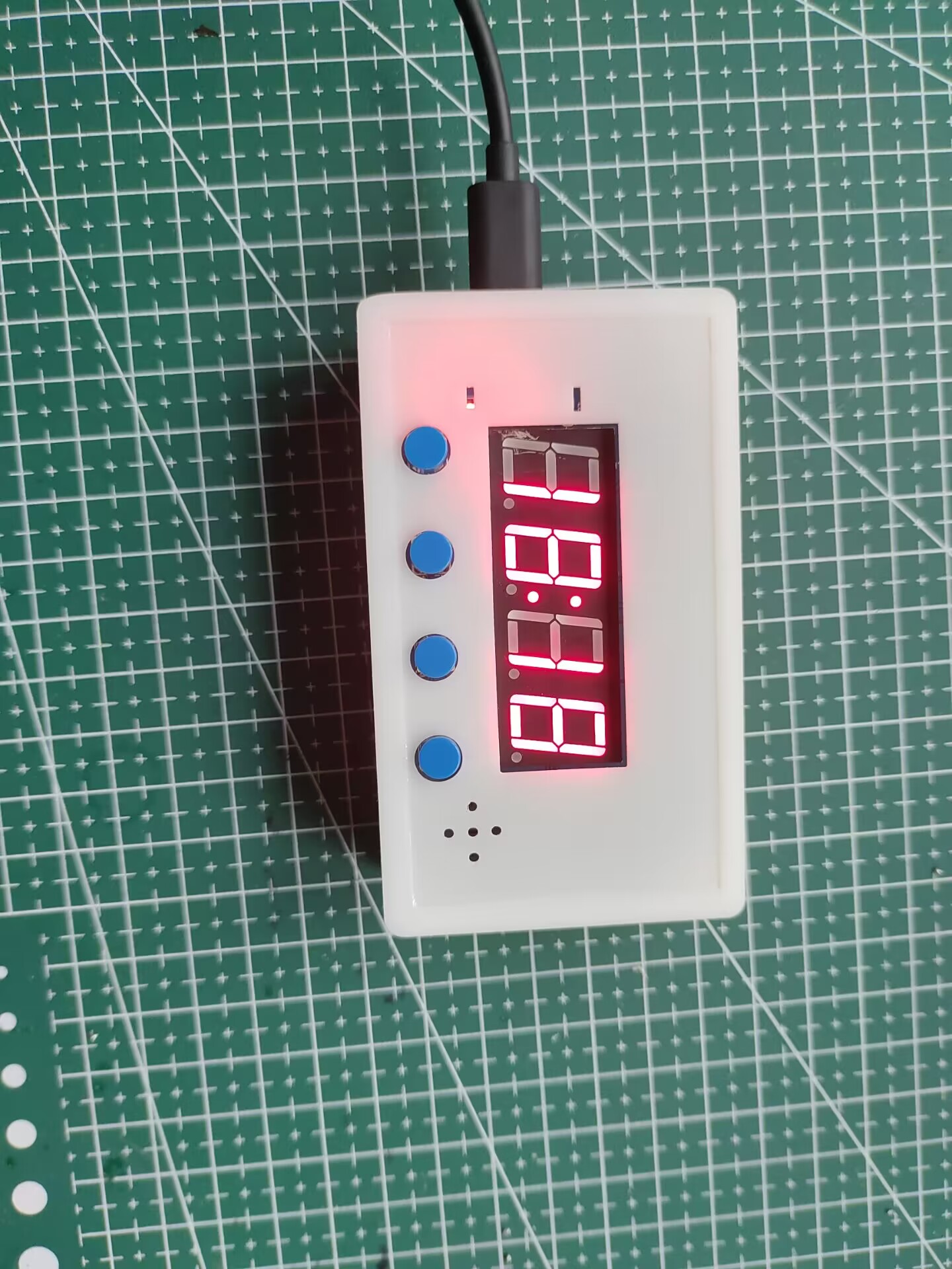 - 长按按键1可进行时间设置,首次长按进行分设置,数码管分位闪烁,此时按按键2为加,按键3为减;再次长按按键1可进行秒设置,之后再次长按可返回时间显示模式并完成设置时间。