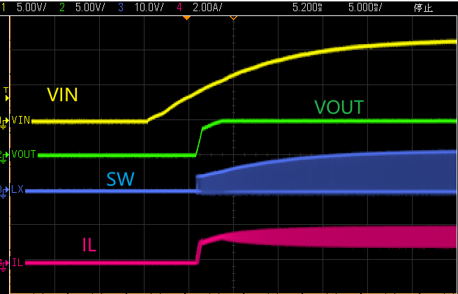 | CCM模式下,输入:12V,输出:5V, 输出电流:1A (纹波的测试) | CCM模式下,输入:12V,输出:5V, 输出电流:1A(开机波形) |