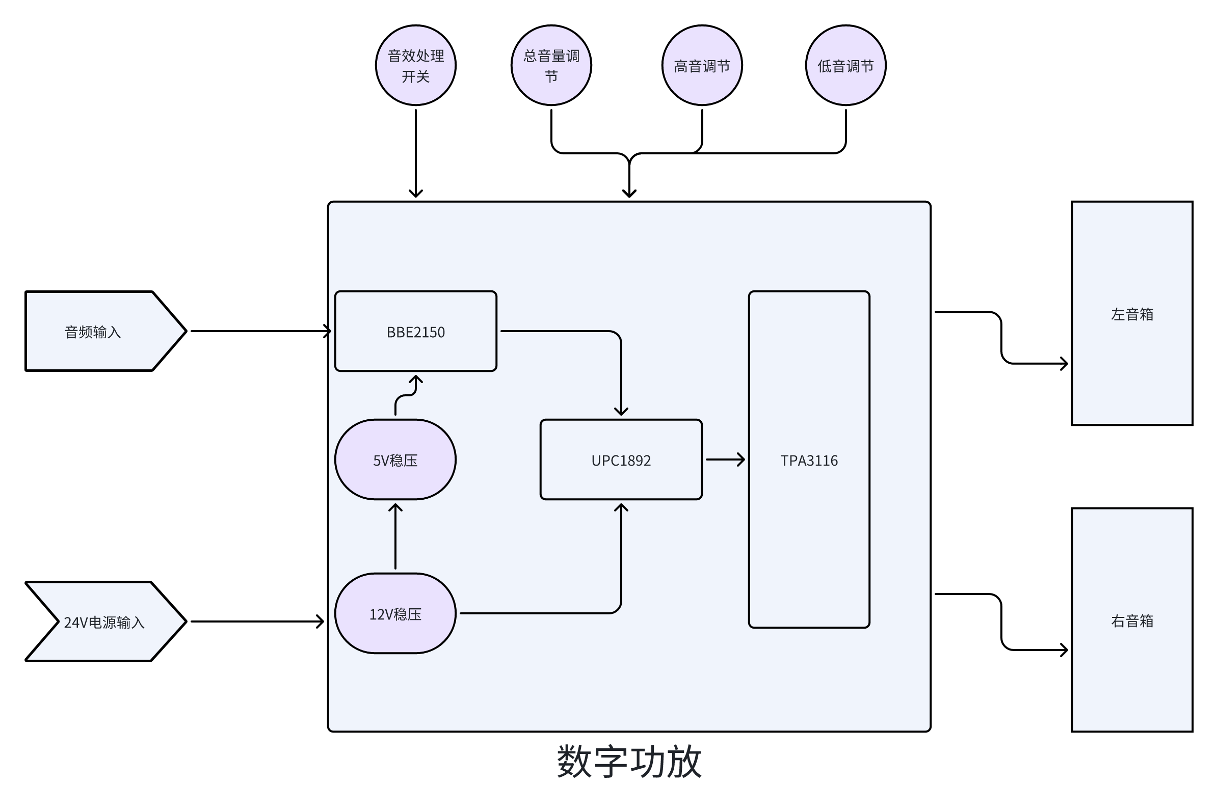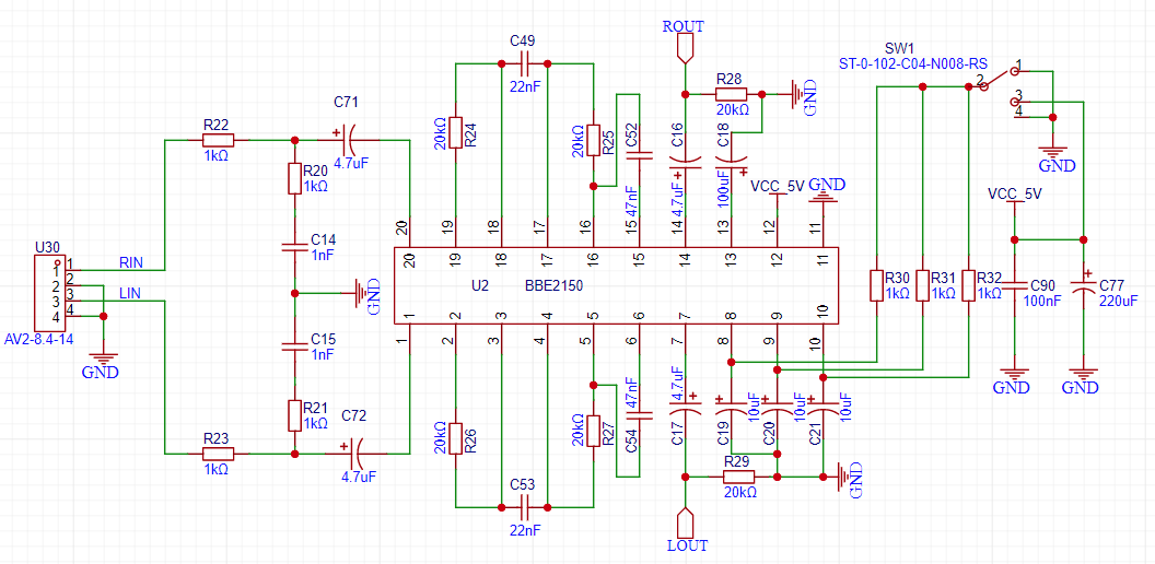 简介:BBE2150+UPC1892作为前级音调,使用TPA3116作为后级放大,具有重低音调节功能,同时还具备一键开启和关闭环绕音的功能!开源协议