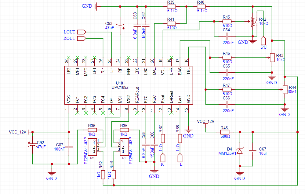 (3)采用UPC1892作为前级音调处理,具有重低音调节和环绕音处理。