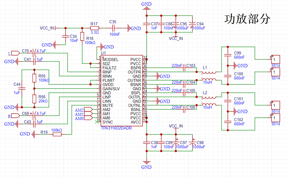 (1)采用TPA3116数字功放IC作为后级驱动。