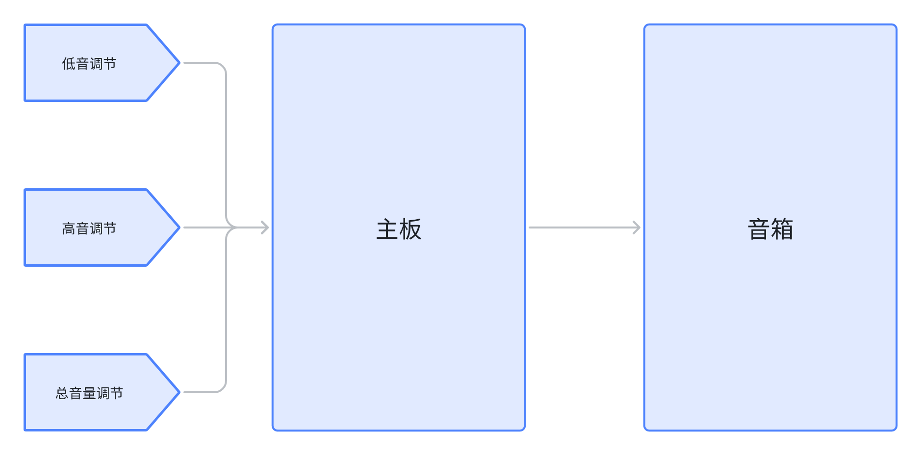 (1)要实现重低音调节功能,那功放必须具备3个可调电阻,即分别负责低音调节,高音调节,总音量调节,如下图所示: