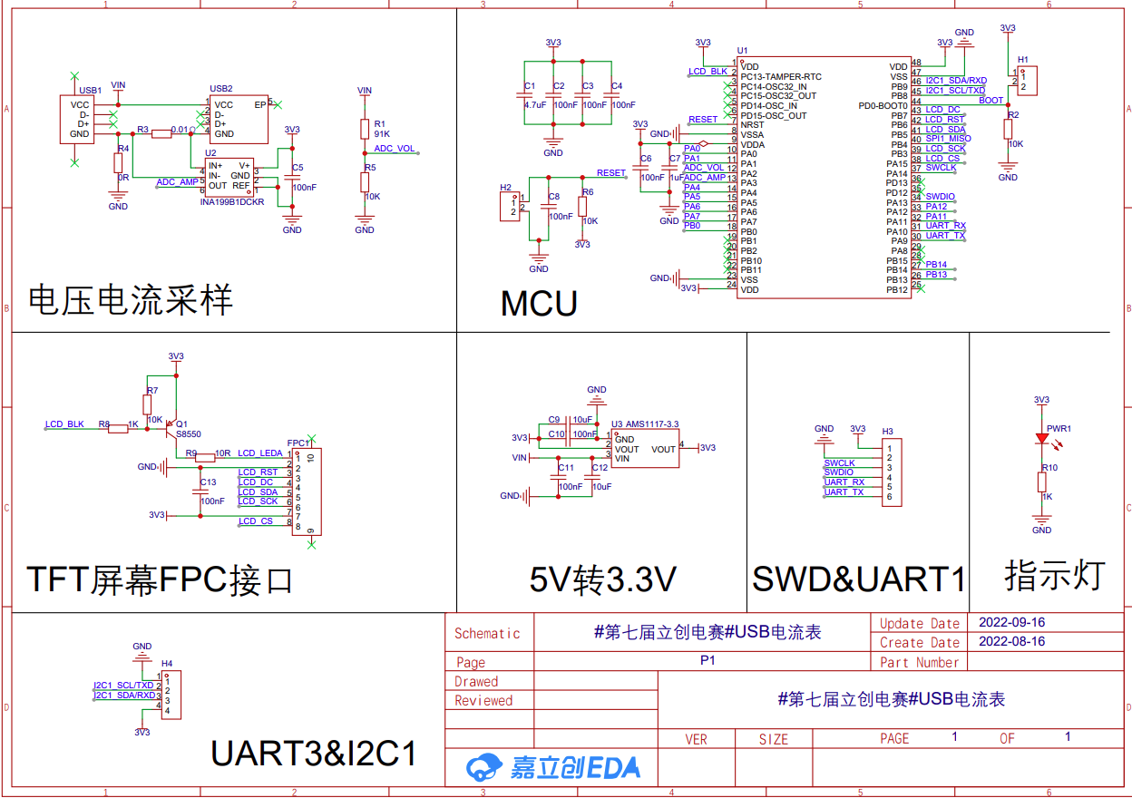 MCU主控部分,电压电流采样,5V转3.3V,TFT屏幕FPC接口,指示灯,SWD下载接口,UART接口,I2C接口等电路。