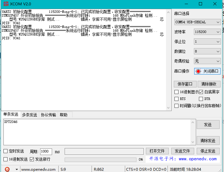 串口矫正:通过Type-C线连接板子和电脑,并且打开串口通讯软件,软件会打包到附件,上电后板子会打印数据到串口软件,检测硬件状态,正常是会出现屏幕型号和FLASH型号