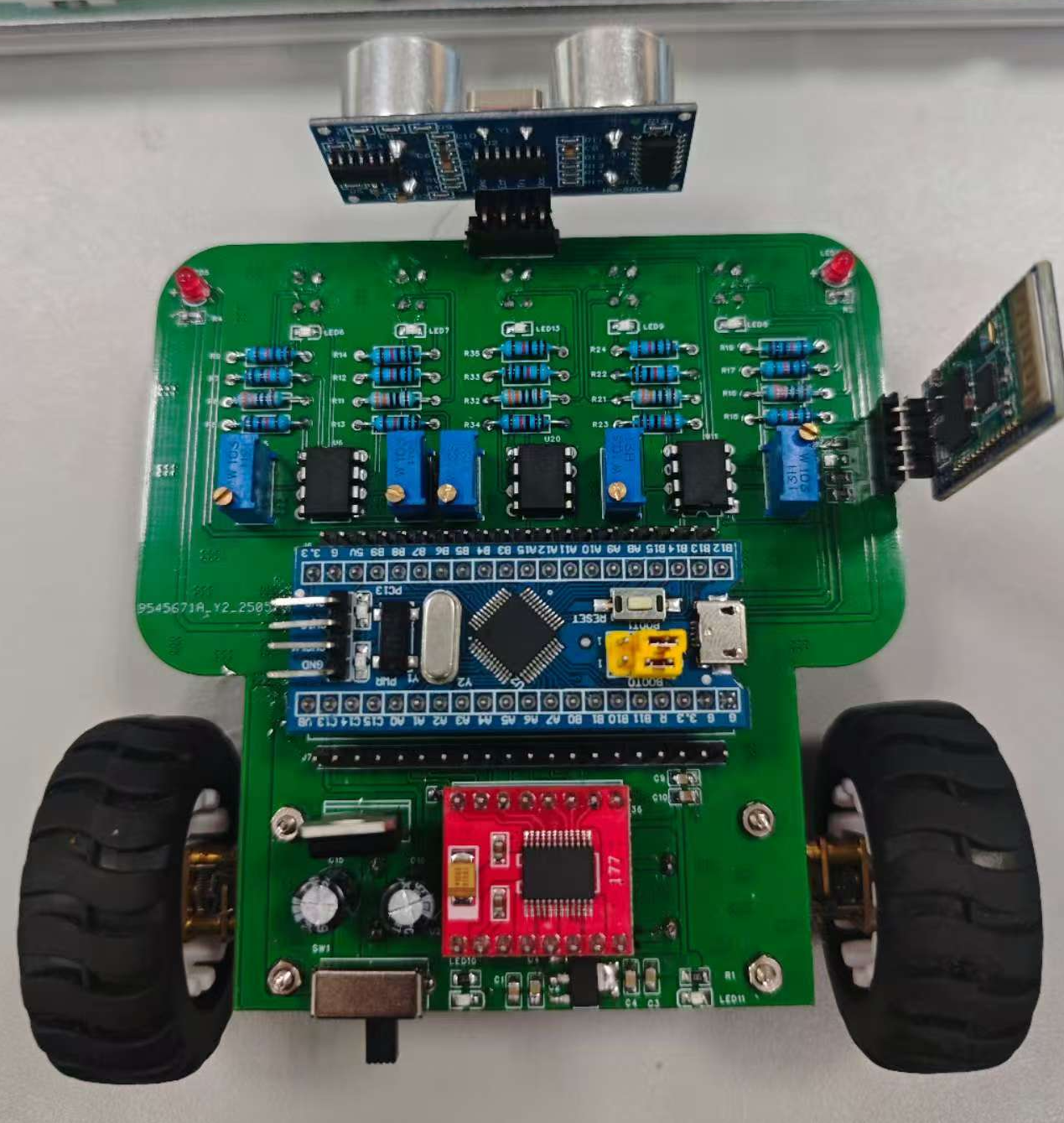 以 STM32F103C8T6 为控制核心,外接蓝牙模块(接收指令)、绘制五路灰度循迹电路(循迹信号采集)、HC - SR04 超声波模块(避障检测),搭配TB6612电机驱动模块 控制直流电机,实现运动控制。