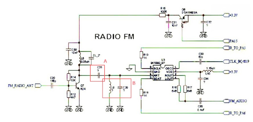 1原机R24三极管放大电路,输出电容需要增大到10nf(A点)以上,到BK1080第6脚的LC滤波需要去掉(B点)。