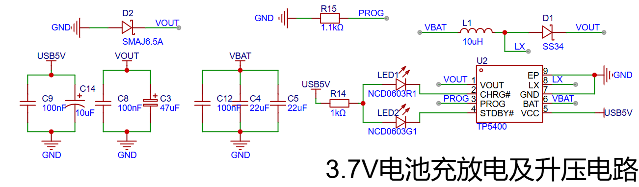 本电路是基于TP5400电源管理IC设计的完整电池供电系统解决方案,主要包含以下子系统: