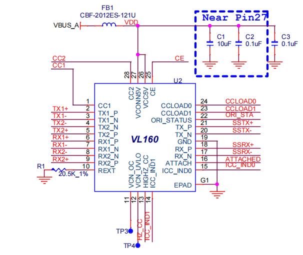 C口采用VL162判定正反,确定通讯,VL162是在VL160的基础上做了更好的优化升级出来代替VL160的数据开关专用芯片,可以直接与VL160 PIN对PIN替换,唯一区别是十脚电阻不一样(LV160是20.5K而VL162是124K)
