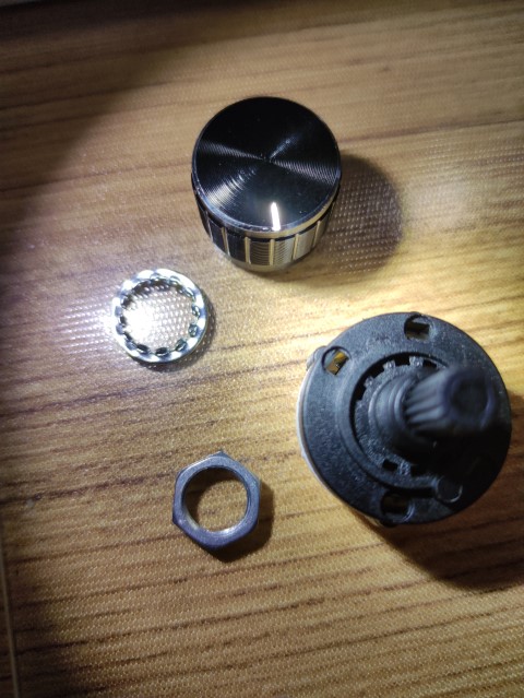 这是一种简易的、经济的3.5mm音频切换器,用到的物料是RS26开关(3刀4档)及配套的铝合金旋钮(一套共3.2元)、pj-313音频插座(2元5个)。