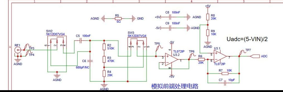 除了电源输入电路为,为保障运算放大器对于负电压的测量性能,使用了XD7660负压产生电路得到一个 负电压,该芯片外围电路简单,只需要两个电容和一个二极管即可工作,理论上输入电压为+5V,也可以输出一个-5V的电压,由于芯片内部存在一定压降及转换效率,实际测量负电压为-4.3V左右,也能满足运算放大器的要求。