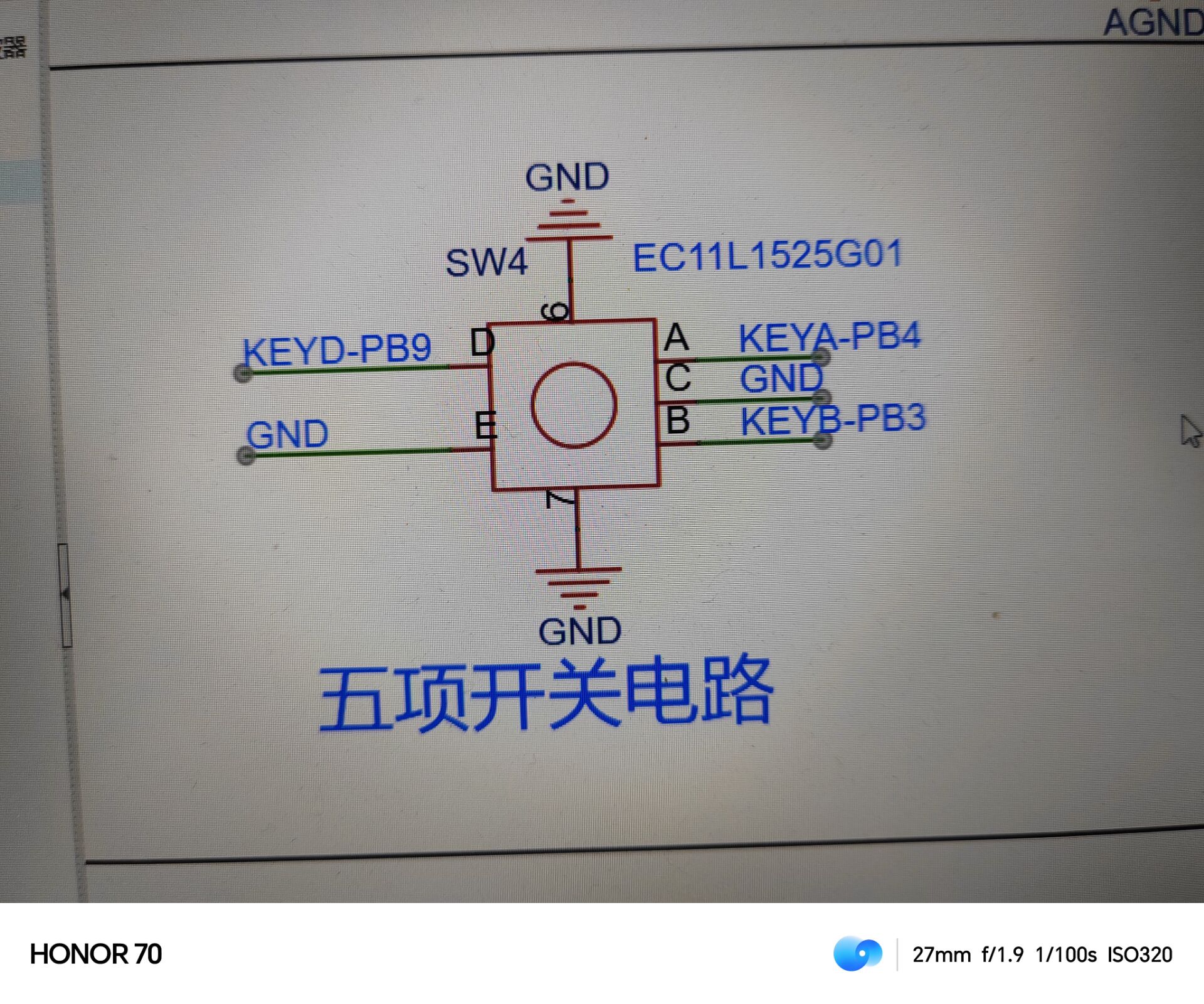 旋转编码器属于一种特殊的按键,该项目使用的EC11旋转编码器有五个引脚,其中DE两个引脚类似于普通按键引脚,按下导通,松手断开,其余ABC三个引脚用于检测旋钮的转动方向,C脚为公共端,直接接地就行。