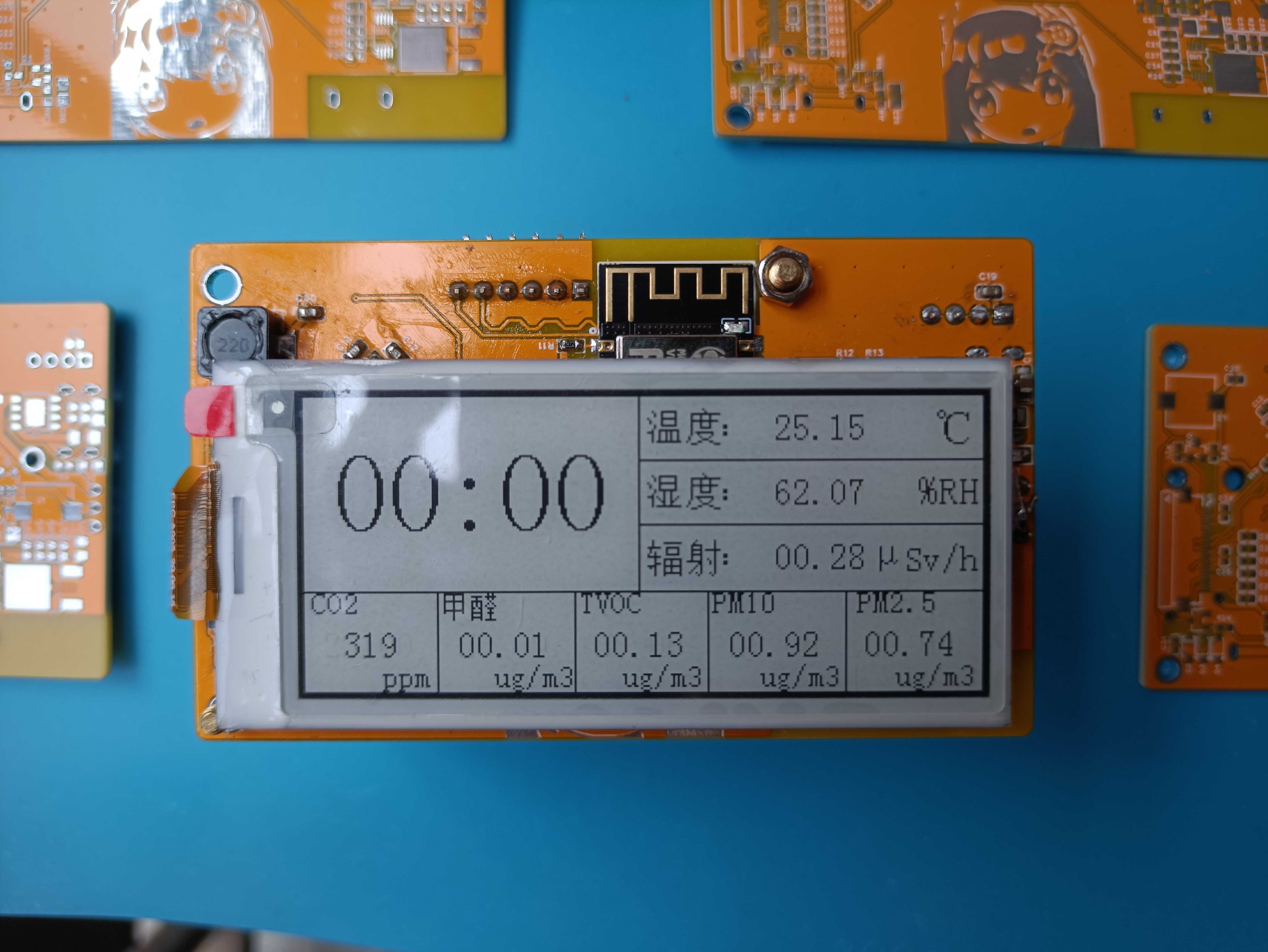 可检测甲醛、CO2、TVOC、PM2.5、PM10、温度、湿度、电离辐射。使用N32G430C8L7作为主控芯片,ESP12作为WIFI模块连接网络,墨水屏使用SPI通讯,七合一空气质量变送器通过串口连接,盖革计数器通过ADC进行采样,内置18650电池可允许移动式检测,使用TypeC接口进行充电。
