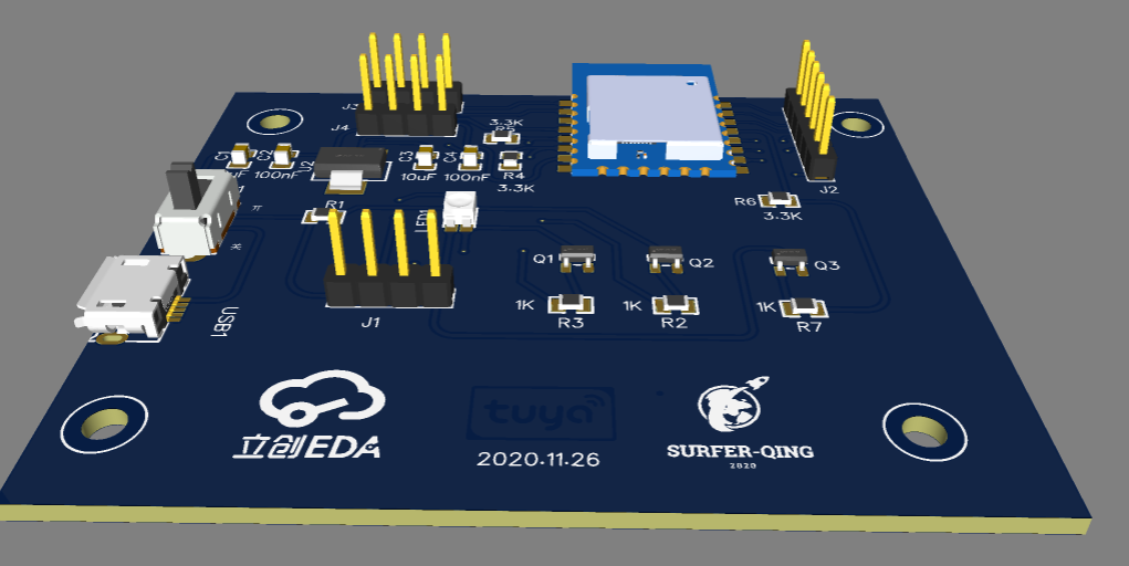 问题及解决方法:在PCB布线的时候,涂鸦的WIFI封装的电源引脚网络是写的“3.3”,而我都板子电源写的是“+3.3”,导致两者之间没有连接,下单打板后才检查发现,不过问题不大,后期焊板子通过飞线连接。焊接元器件时上锡不用太多,要检查每个元器件是否存在虚焊,在检查电压是否正常。