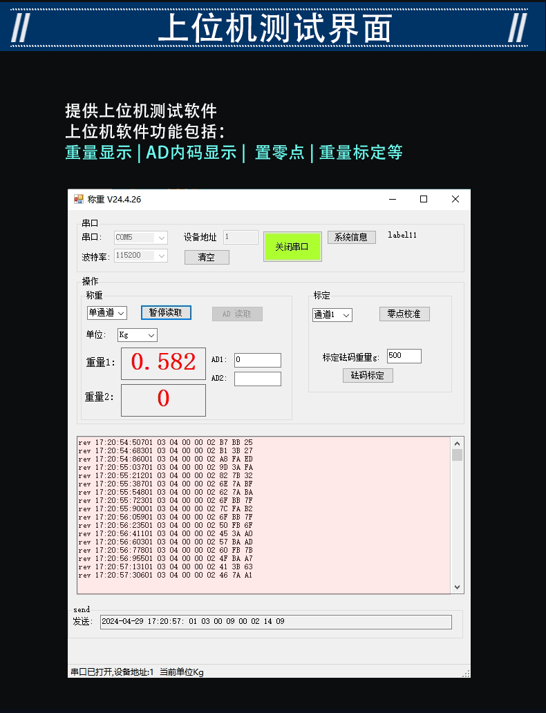 4、通信协议支持置零,读取重量,读取AD原始数据,重量标定,通信地址修改