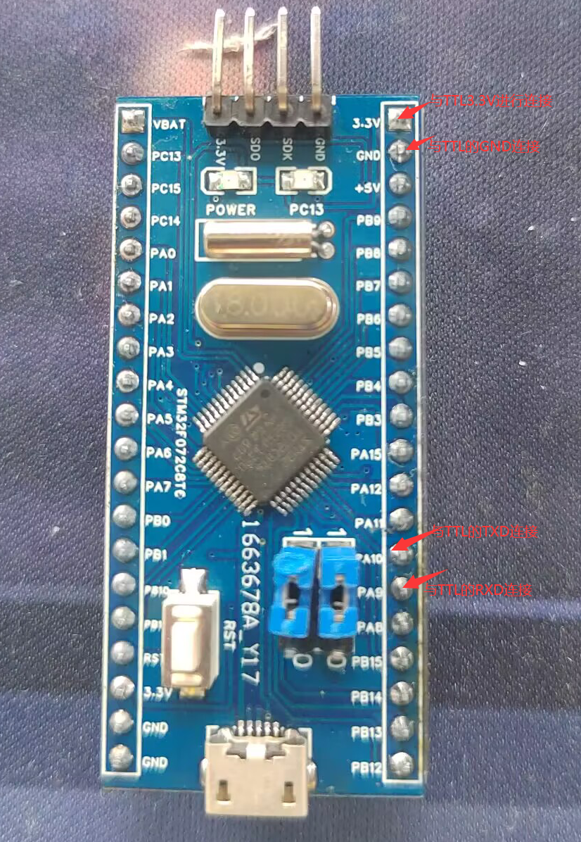 - 可以采用ST-LINK下载也可以采用USB-TTL模块(建议连接电压时采用3.3v下载稳定,进行TTL下载时请将管脚PA10(RXD) PA9(TXD) 与 TTL模块的TXD RXD相接,并将BOTT0置1,BOTT1置0,将开发板与TTL进行连接,打开软件,查看COM口是否已经连接上,进行烧录即可)这里以TTL下载做个简单概述,相关软件,教程,驱动,点灯调试代码以及BOM表我都会在后续放在附件里面,请自行查看下载。