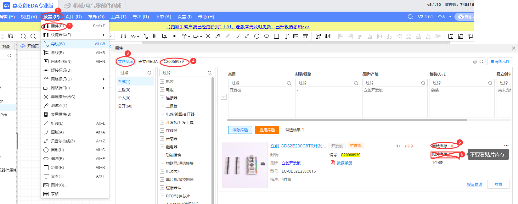 注意绘制原理图时,一定要根据物料清单的器件编号,在立创EDA查找后放置。