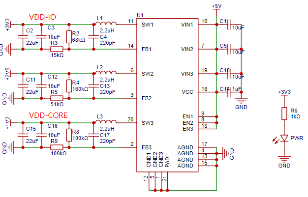 电源部分使用EA3036三路DCDC芯片,并未采样三路LDO的方式,一来减小占用面积二来提高效率也方便简化设计: