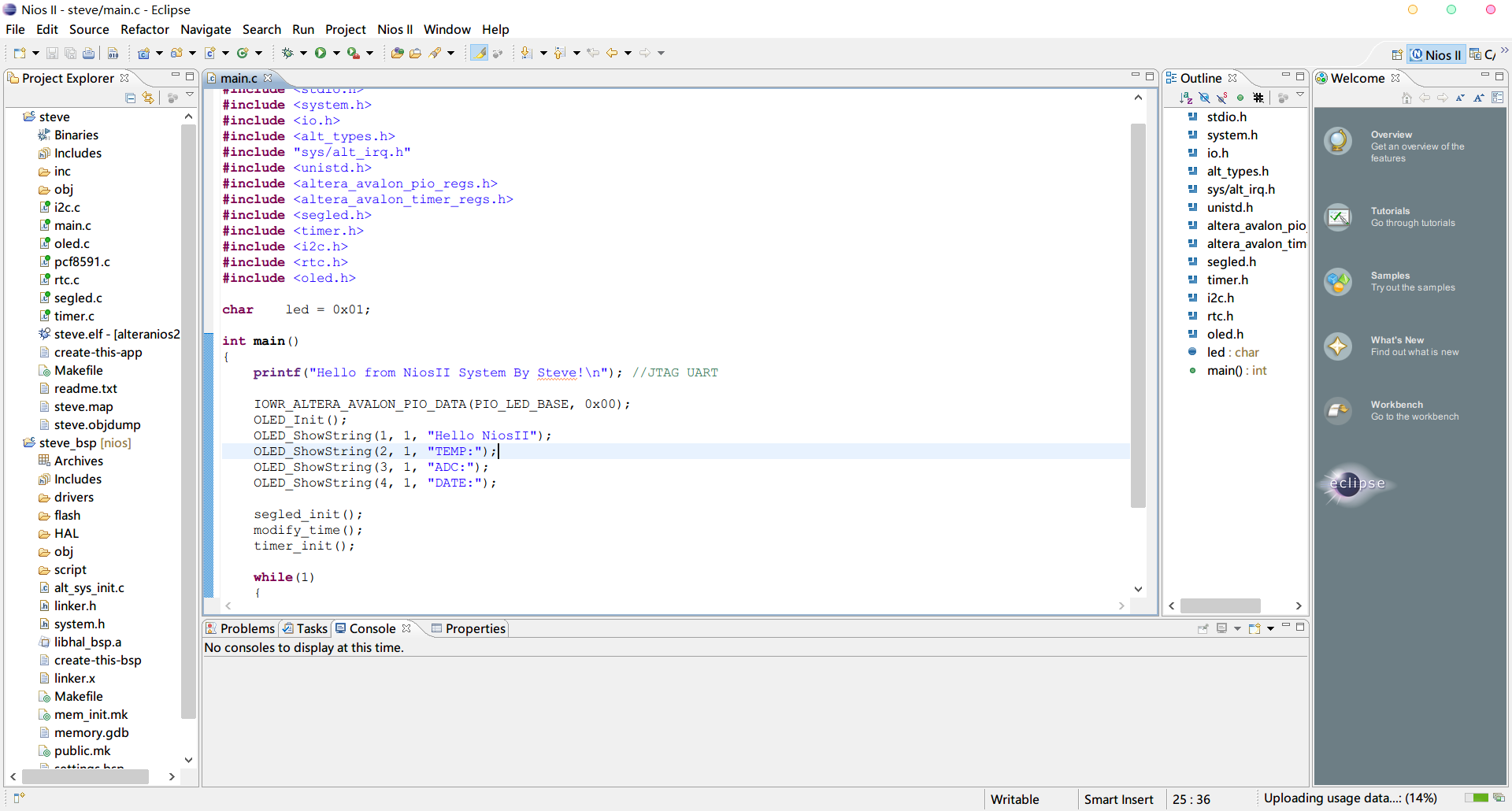 文章提供NiosII软核源码,代码使用在QuartusII13.1.0及QuartusII18.1.0中搭建的NiosII软核,控制段码屏动态刷新显示时间;OLED显示温度、日期、AD采样数据等;控制AD采样光敏电阻数据;控制LED流水的等功能。基本使用了板子上的大部分外设,NiosII的RAM设置为SDRAM,其运行在100MHz下。