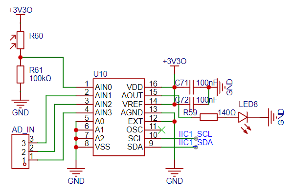 AIN0用于采集光敏电阻分压,其他三输入引出、DAC输出接LED可实现呼吸灯等功能(代码中没有写该功能,但dac操作函数已经留在那儿了)。