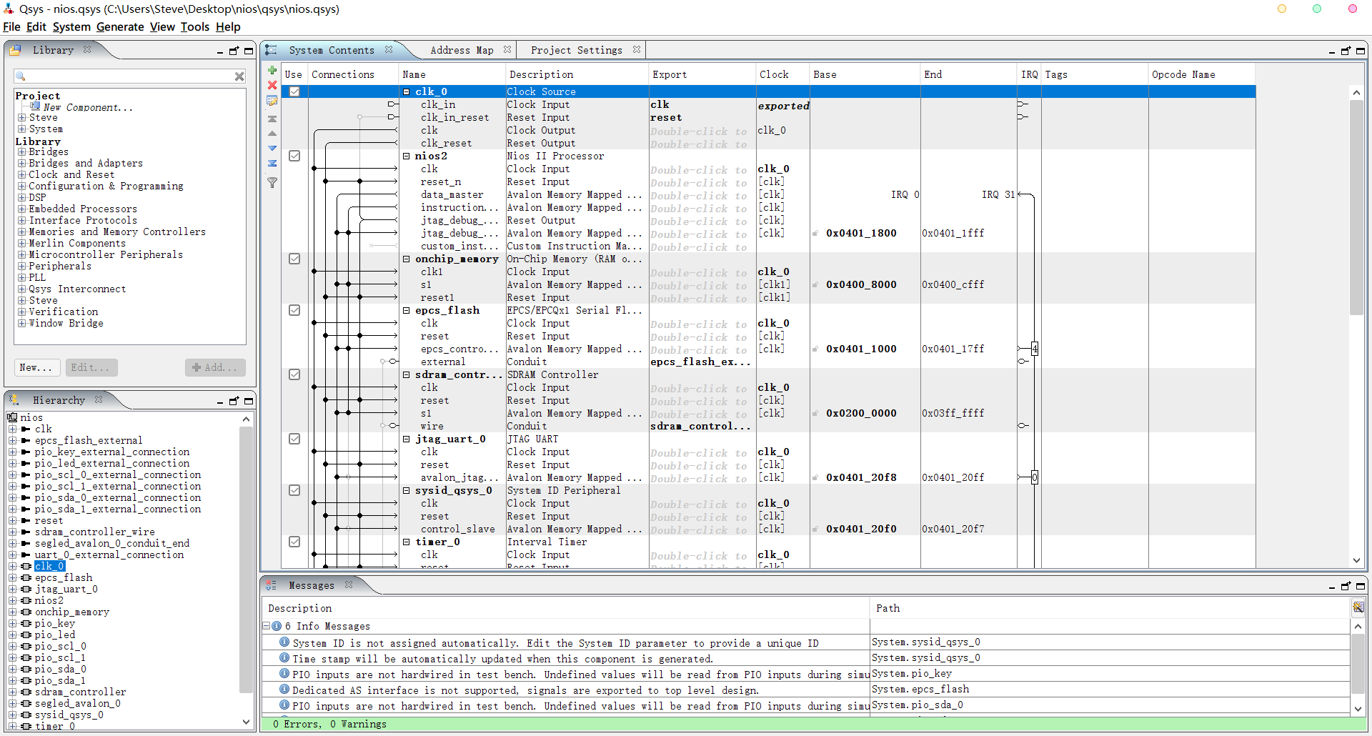 上图是qsys中搭建的niosII核,从上到下为:时钟源、nios软核(将reset地址设置到epc、exception地址设置到sdram)、onchipRAM(分配20KB、自行修改或删除)、SDRAM控制器(自行根据芯片修改时序信息)、jtag uart、sysid