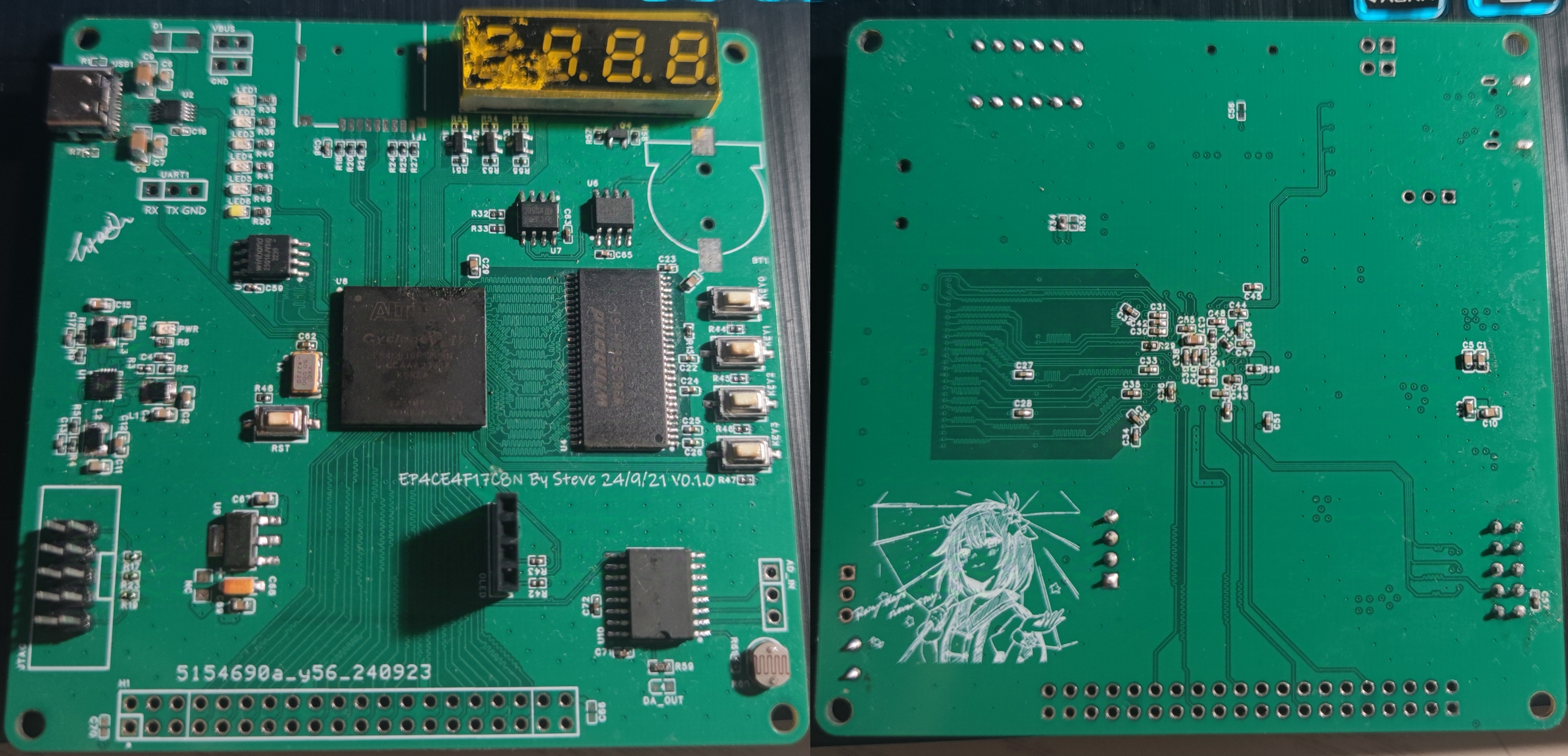 采样Altera的FPGA,外设配有SDRAM、RTC、EEPROM、SPI FLASH、OLED、SD、AD/DA、数码管、按键及LEDs。可作为入门学习用,板子测试通过,例程提供NiosII程序。