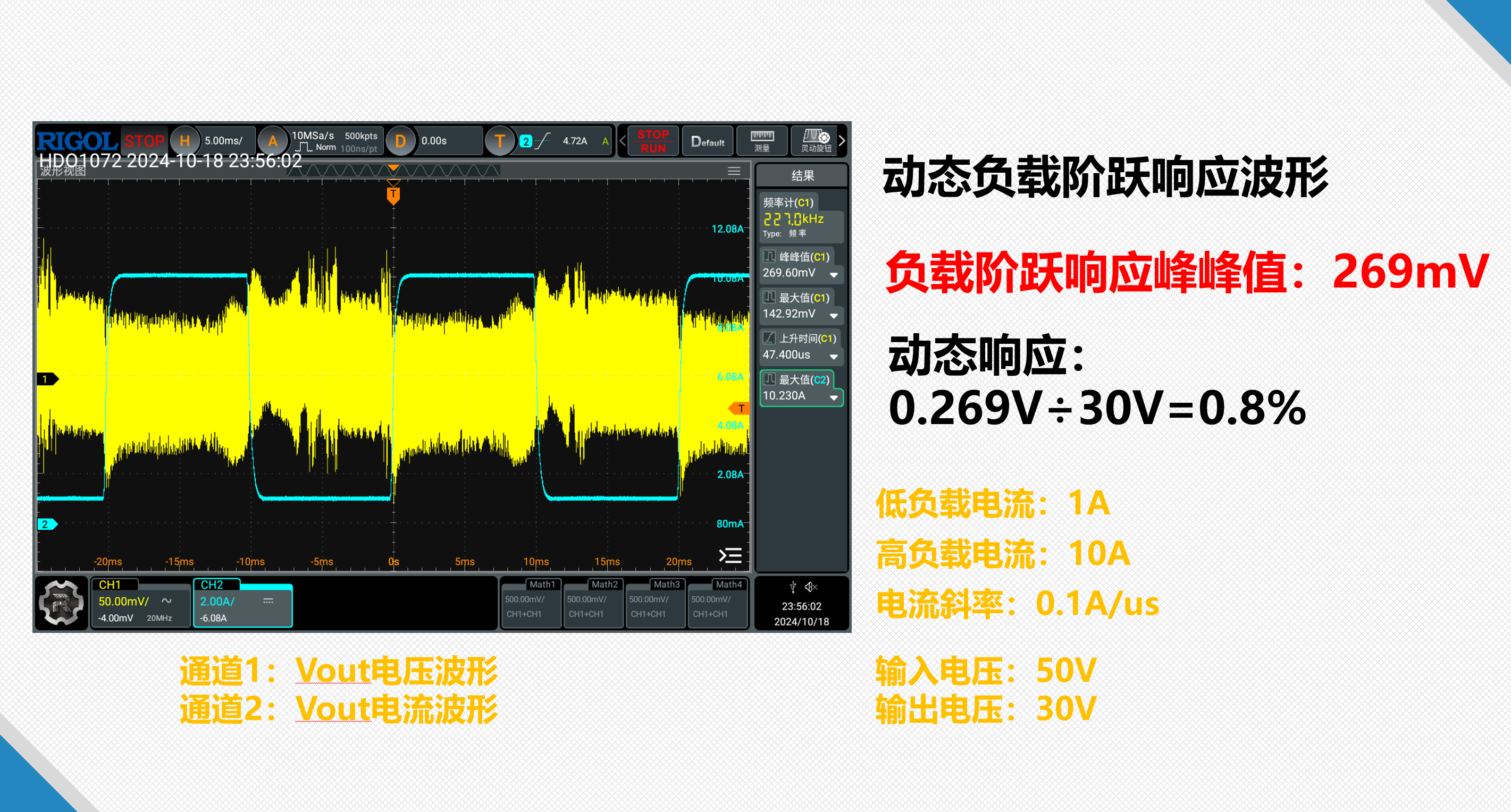 动态负载阶跃响应测试,在此测试中纹波电压占主体,电压跌落并不明显,做到了0.8%,小于1%算比较优秀了