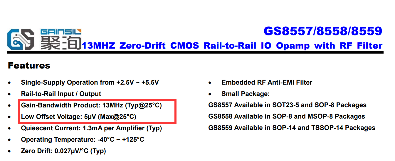 GS8558是一款Rail-to-Rail运放,高带宽13MHz,同时输入失调电压非常低(5uV)