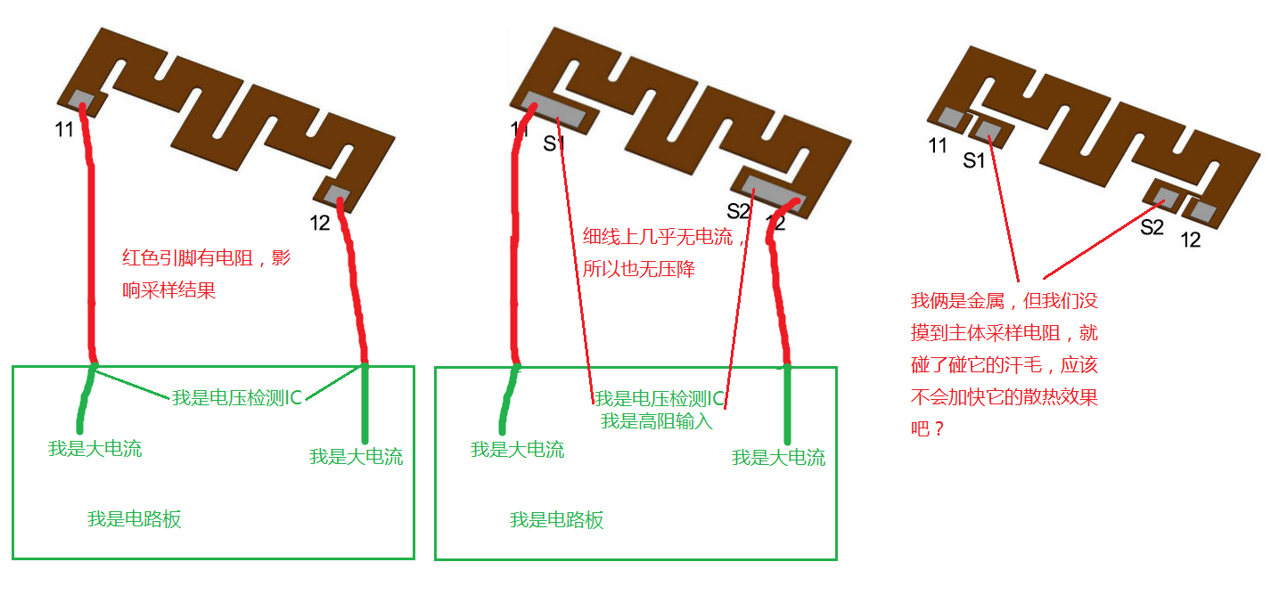 这种结构在电流脚之间测得的阻值和电压脚之间测得的阻值会有差异,但对检测精度没有影响