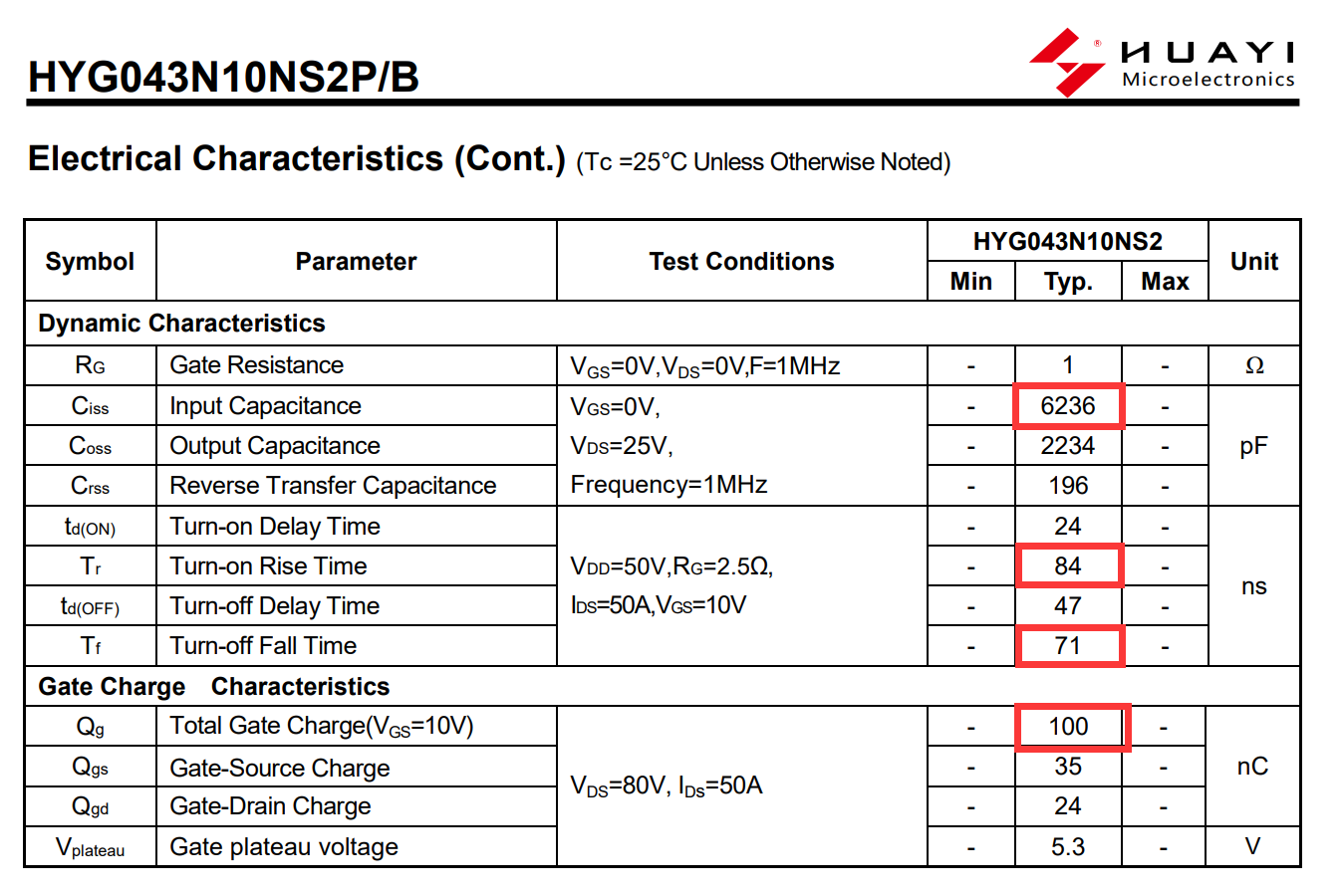 关于MOS管的选用,目前选用的MOS管型号为HYG043N10,此MOS管除了DS电压有100V,内阻相对较小之外,其他参数并不好