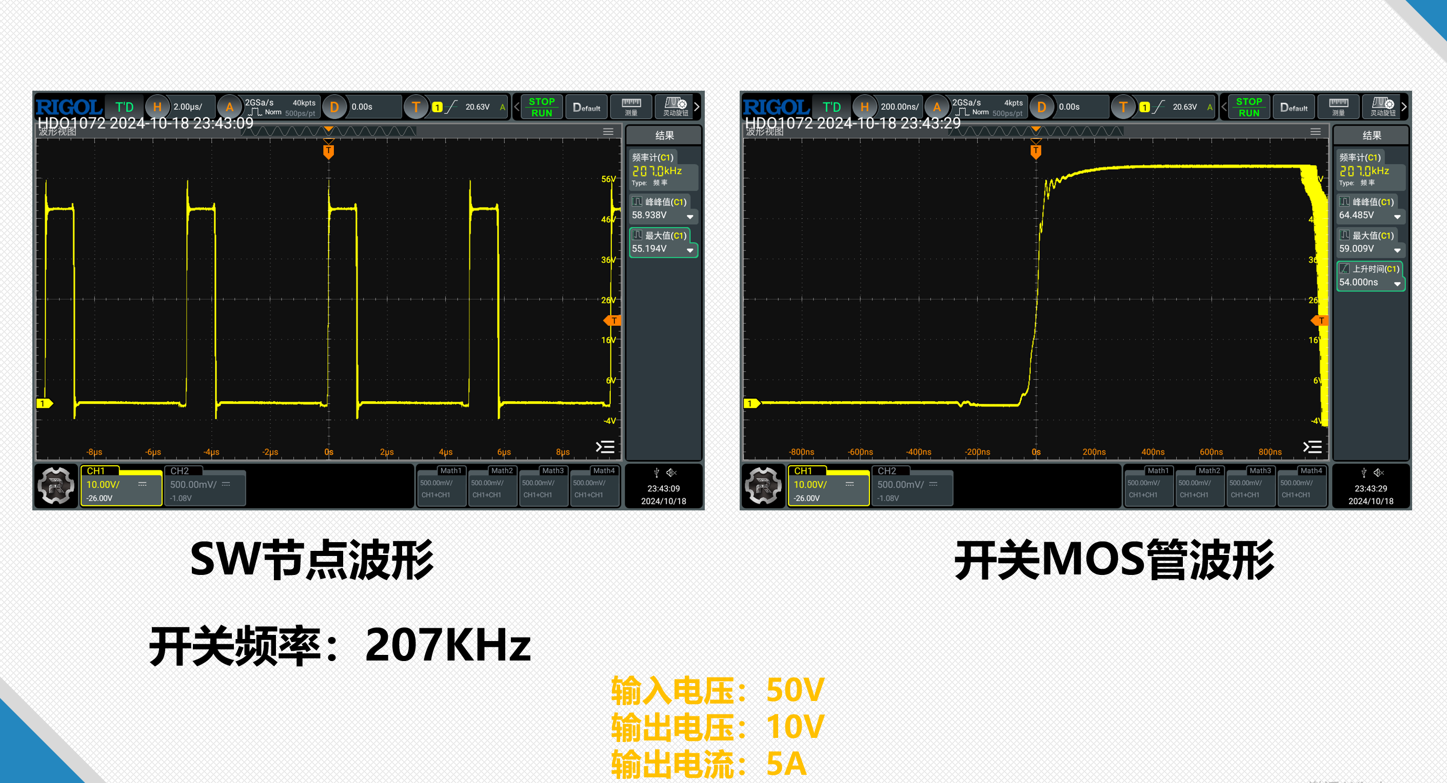 输出电压10V,输出电流5A,功率50W,开关节点有明显振铃,但开关MOS管栅极没有振铃,此问题主要是因为TO-220封装的MOS管内部的ESL导致的