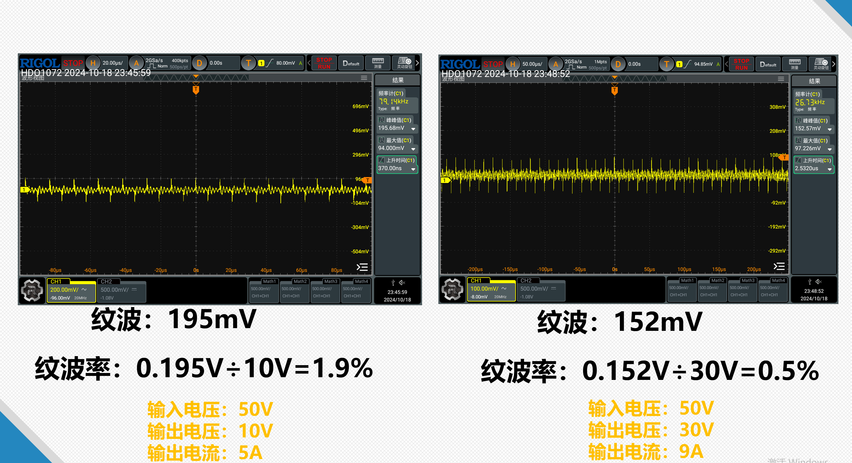 10V输出和30V输出下的纹波表现,10V输出时的纹波略大,超过1%