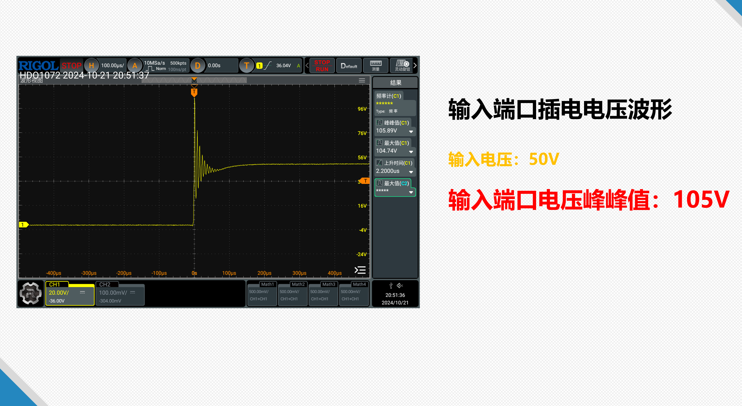 测试的时候发现热插拔浪涌控制芯片出现了多次损坏,50V电压输入的情况下,测试发现输入端口电压尖峰达到了105V