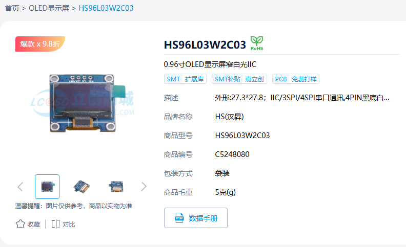 | 4 | 1 | 13.14 | U1 | OLED-TH_L27.8-W27.2-P2.54_C9900033791 | HS96L03W2C03 | HS(汉昇) | C5248080 |