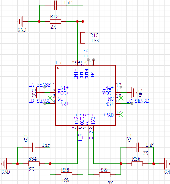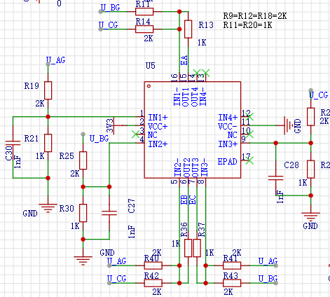 U5是4路通用运放,型号:LM324QT,封装尺寸:VQFN-16_L3.0-W3.0-P0.50-TL-EP 是我能在立创商城找到的最小体积的4路运放。根据模电的知识,按照式7.2接成加减法运算电路。