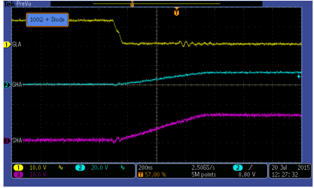 G极串联100欧姆电阻并联1N4148二极管( 200nS/div)