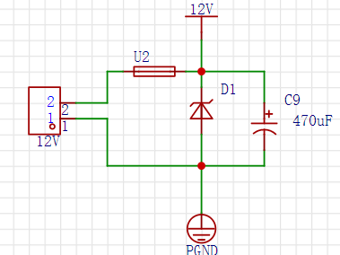 DC12V进入后首先经过一次性保险丝,并联一只14V瞬态二极管。当输入电压高于14V后二极管被击穿,二极管两端电压始终保持在14v,从而使后级负载不被过电压烧毁,当有大电流或者D1二极管被击穿导通时保险丝动作,以此保护后级芯片。470uF电解电容用于为电机提供突变的电流。实际板子中焊接了2个470uF电解电容,可按照实际情况按需焊接。