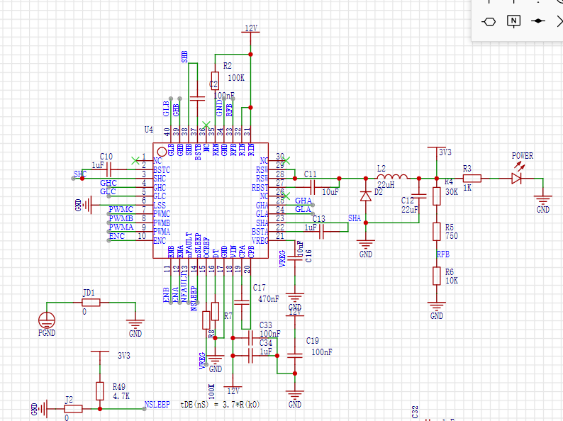 按照芯片手册设计即可,需要自己设计参数的地方有死区时间的设定、短路电流的设定。分别对应DT和OREF引脚的电阻值选取。注意nSLEEP引脚需要外接上拉电阻到3.3V芯片才能启动,这里我踩过坑。